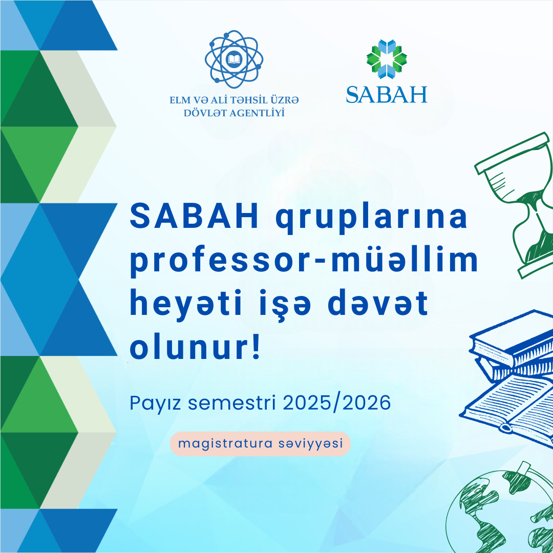 Azərbaycan Respublikası Elm və Təhsil Nazirliyinin yanında Elm və Ali Təhsil üzrə Dövlət Agentliyi SABAH qrupları layihəsinin magistratura səviyyəsində 2025/2026–cı tədris ilinin payız semestri üçün müvafiq ixtisaslar üzrə fənlərin tədrisi məqsədilə professor-müəllim heyəti saathesabı qaydada işə dəvət olunur