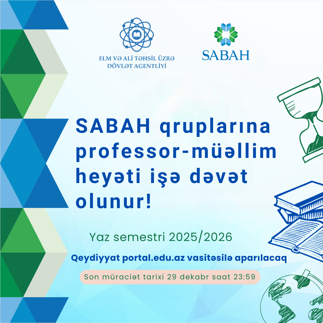 Azərbaycan Respublikası Elm və Təhsil Nazirliyinin yanında Elm və Ali Təhsil üzrə Dövlət Agentliyi SABAH qrupları layihəsinin bakalavriat səviyyəsində 2025/2026–cı tədris ilinin yaz semestri üçün müvafiq ixtisaslar üzrə fənlərin tədrisi məqsədilə professor-müəllim heyəti saathesabı qaydada işə dəvət olunur