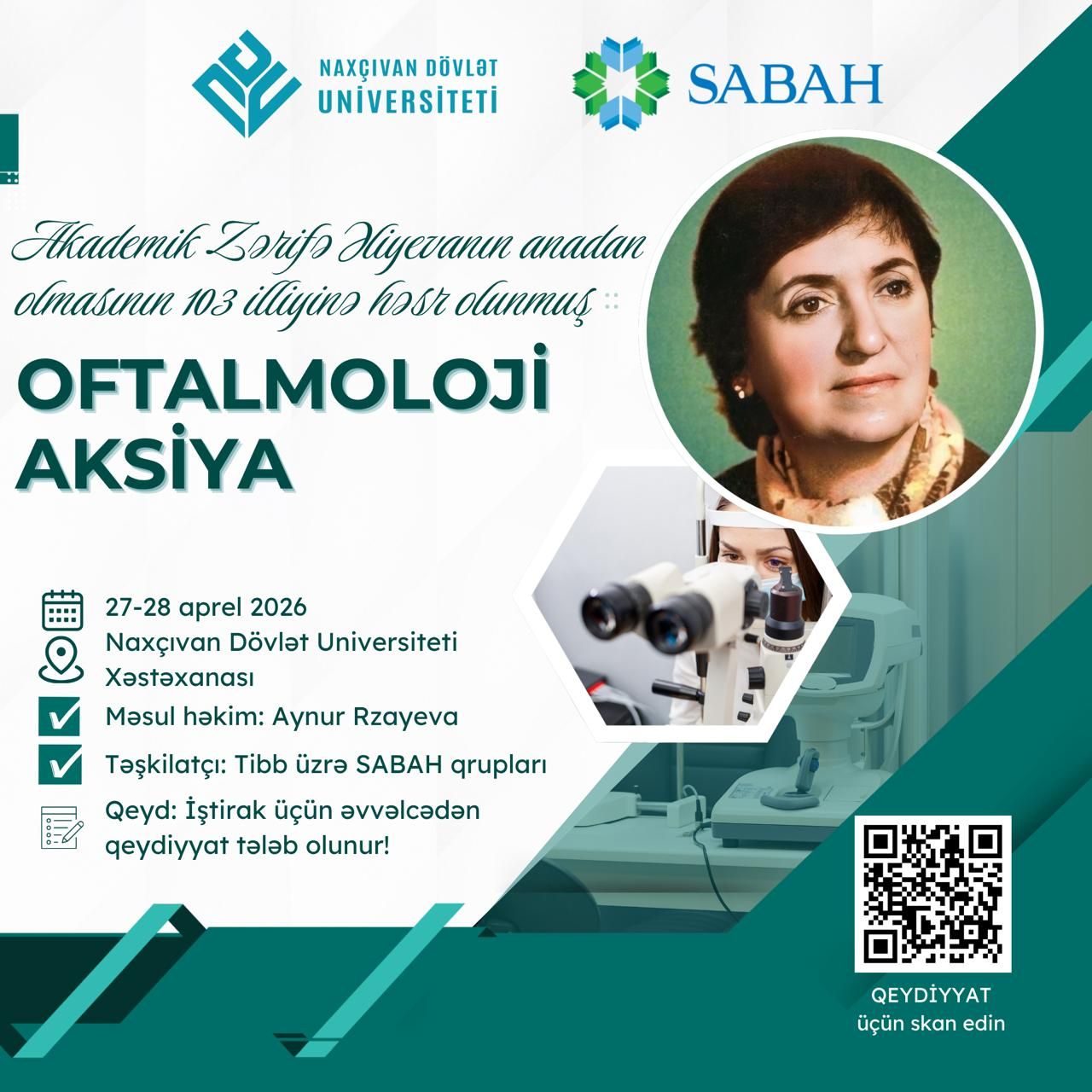 Akademik Zərifə Əliyevanın anadan olmasının 103-cü ildönümünə həsr olunmuş oftalmoloji aksiya çərçivəsində SABAH qrupları Naxçıvan Dövlət Universitetinin tibb ixtisası üzrə III kurs tələbələri tərəfindən universitet tələbələri üçün pulsuz göz müayinəsi aksiyası keçiriləcəkdir.