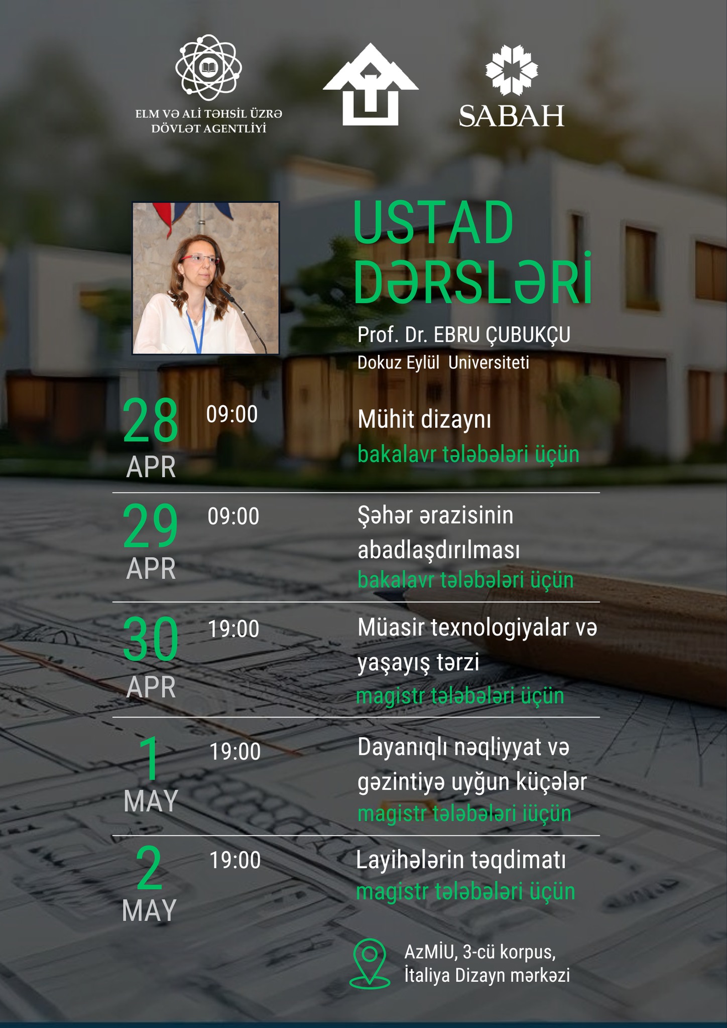 Ustad dərsləri Türkiyənin #Dokuz #Eylül Universitetinin professoru Ebru Çubukçu tərəfindən aparılmışdır. Tədris proqramı tələbələrin nəzəri biliklərinin praktiki bacarıqlarla inteqrasiyasını təmin etmək, müasir şəhərsalma və memarlıq yanaşmalarını mənimsətmək və beynəlxalq təcrübələri öyrənmək məqsədini daşımışdır. Dərslər memarlıq və şəhərsalma ixtisasında təhsil alan bakalavr və magistr tələbələrini əhatə etməklə gün ərazində səhər və axşam saatlarında həyata keçirilmişdir.
