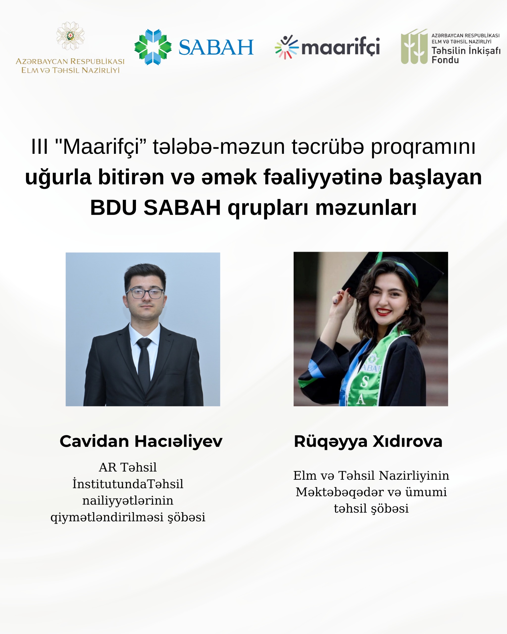 SABAH qrupları Bakı Dövlət Universitetinin məzunları Cavidan Hacıəliyev və Rüqəyya Xıdırova Elm və Təhsil Nazirliyinin təşəbbüsü və Təhsilin İnkişafı Fondunun dəstəyi ilə icra olunan üçüncü “Maarifçi” tələbə-məzun təcrübə proqramını başa vuraraq, nazirlik və tabe qurumların strukturlarında əmək fəaliyyətinə başlayıblar.