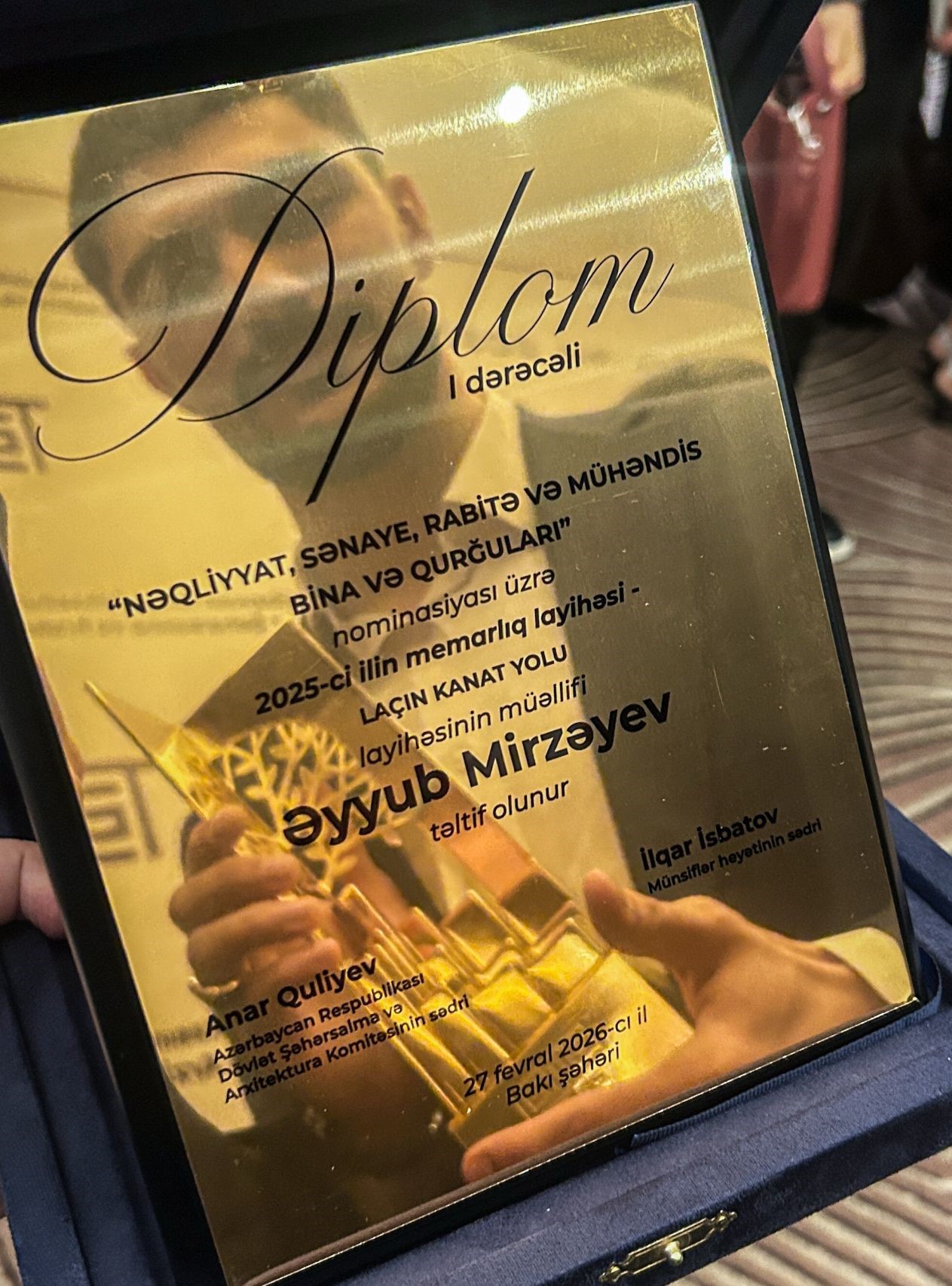 Ötən ilin ən yaxşı memarlıq layihələri mükafatlandırılıb. “Nəqliyyat, sənaye, rabitə və mühəndis bina və qurğuları” nominasiyası üzrə “Təməl” mükafatının laureatı – Laçın kanat yolu layihəsi ilə SABAH qrupları Azərbaycan Memarlıq və İnşaat Universitetinin magistratura səviyyəsi üzrə “Dayanıqlı şəhərsalma və regionların planlaşdırılması” ixtisasının 2024-cü il məzunu Əyyub Mirzəyev olub.