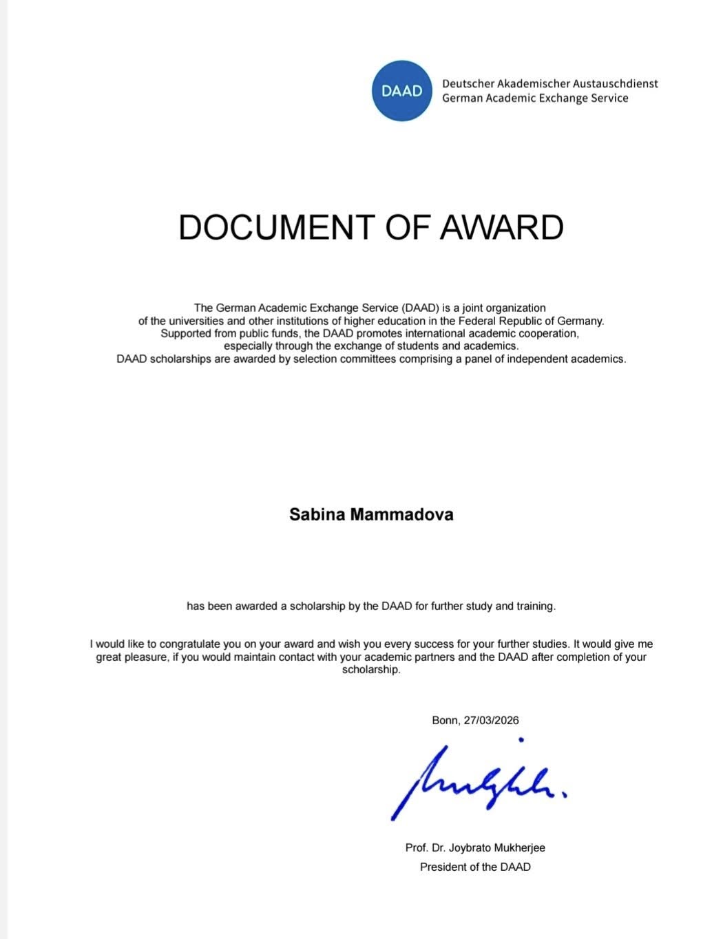 SABAH tələbəsi DAAD proqramının qalibi oldu