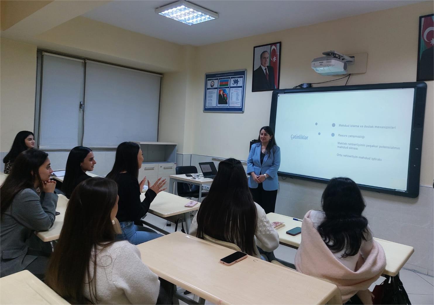 “Məktəblərdə keyfiyyət monitorinqi” layihəsinin akademik rəhbəri Aysel Əzimova tərəfindən 16.12.2025-ci il tarixində Azərbaycan Dövlət Pedaqoji Universitetinin SABAH qruplarında Təhsildə qiymətləndirmə və monitorinq ixtisaslaşması üzrə təhsil alan tələbələr üçün “Ümumtəhsil məktəblərində keyfiyyət monitorinqləri” mövzusunda seminar təşkil olunmuşdur.